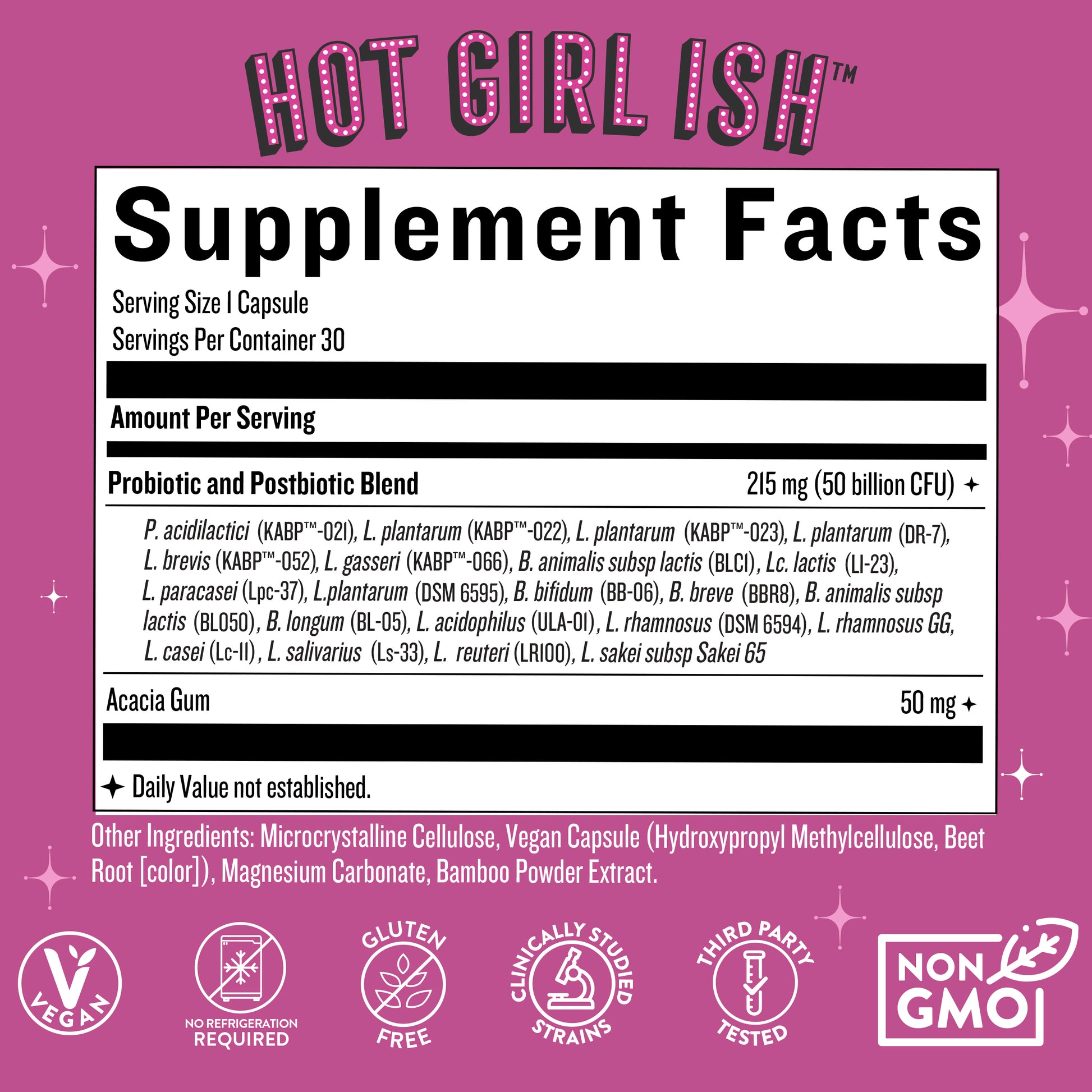 Hot Girl Ish: P. acidilactici (KABPTM-021), L. plantarum (KABPTM-022), L. plantarum (KABPTM-023), L. plantarum (DR-7), L. brevis (KABPTM-052), L. gasseri (KABPTM-064), B. animalis subsp. lactis (BLCI), Lc. lactis subsp. lactis (LI-23), L. paracasei (Lpc-37), L. plantarum (DSM 6595), B. bifidum (Bb-06), B. breve (BBR8), B. animalis subsp. Lactis (BL050), B. longum subsp. longum (BI-05), L. acidophilus (UALa-01), L. rhamnosus (DSM 6594), L. rhamnosus GG, L. casei (Lc-11), L. salivarius (Ls-33), L. reuteri (LR100), L. sakei 65, Acacia Gum, Microcrystalline Cellulose, Vegan Capsule (Hydroxypropyl Methylcellulose, Beet Root [color]), Magnesium Carbonate, Bamboo Powder Extract.